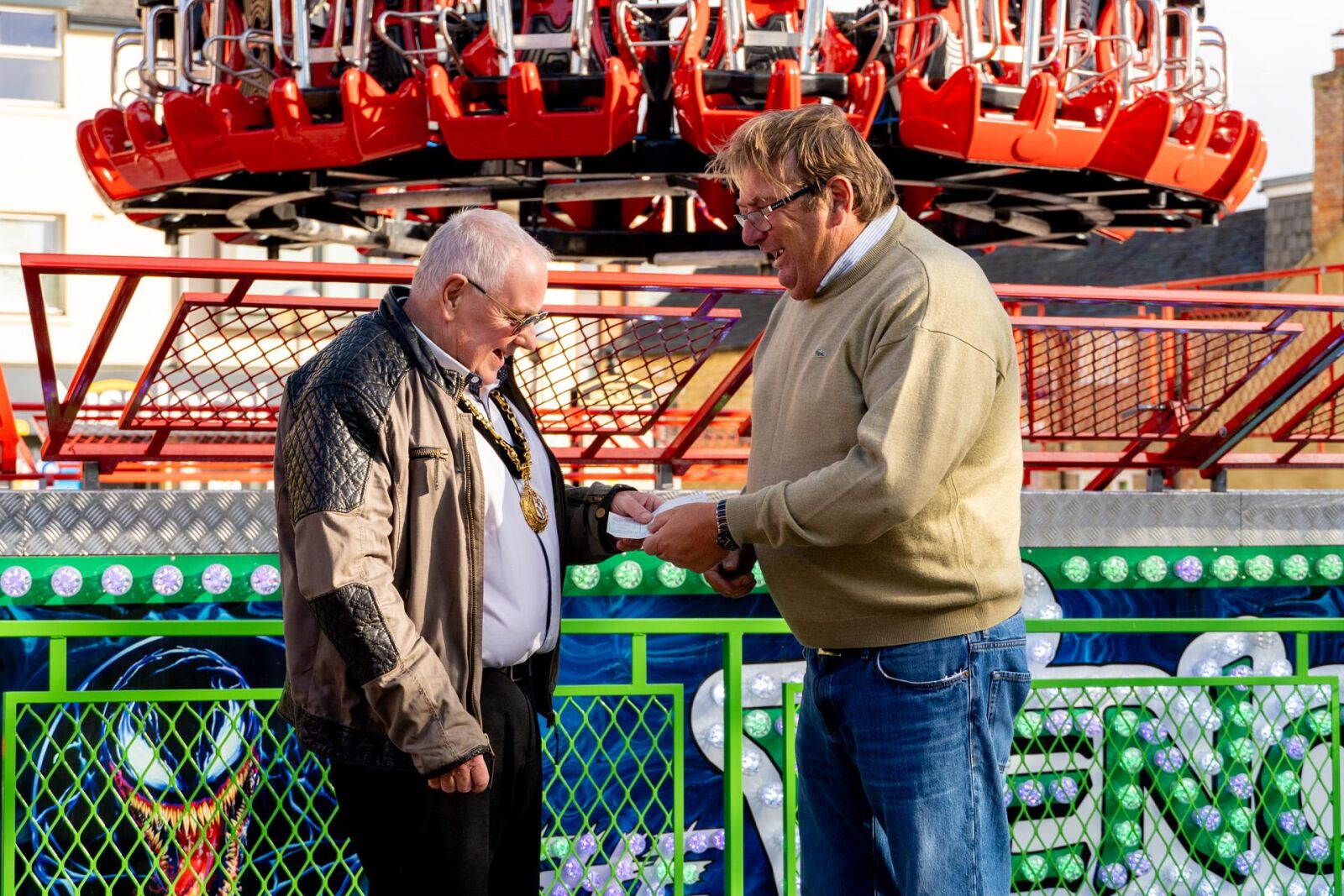 The Brackley Charter Fair is now officially open! On the afternoon of Thursday 11 September, the Mayor of Brackley, Cllr Bernie Tiller, received a generous donation towards the Mayor’s charity, b Yourself, from Wilson’s Amusements. Tommy Wilson spoke about his family’s historic connections to Brackley before presenting the cheque to the Mayor.
