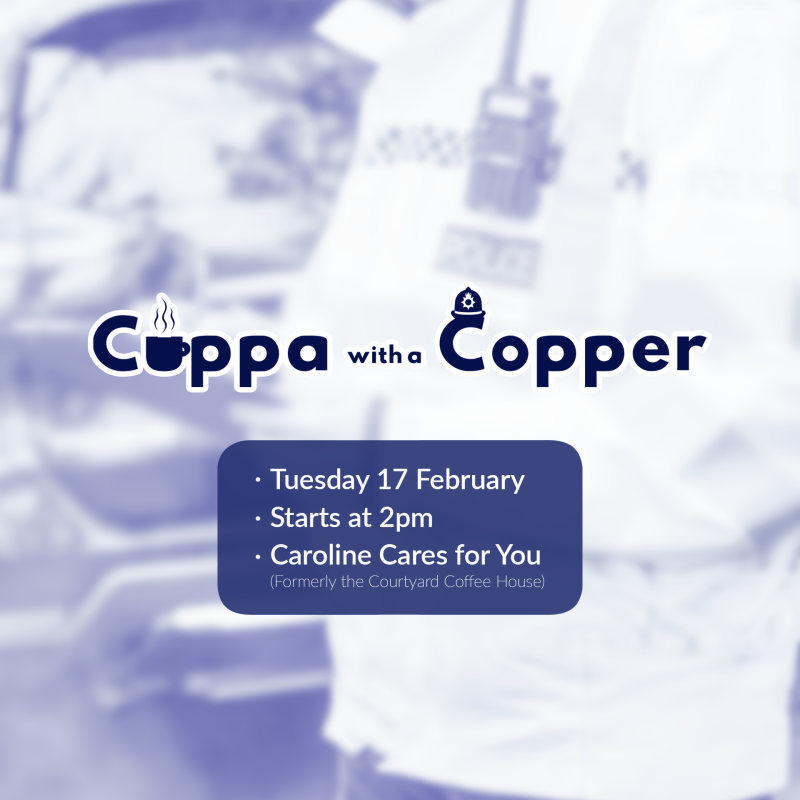 Officers from the local neighbourhood policing team will be holding a ‘Cuppa with a Copper’ police surgery at Caroline Cares for You (formerly The Courtyard Coffee House) on Tuesday 17 February, starting at 2pm.